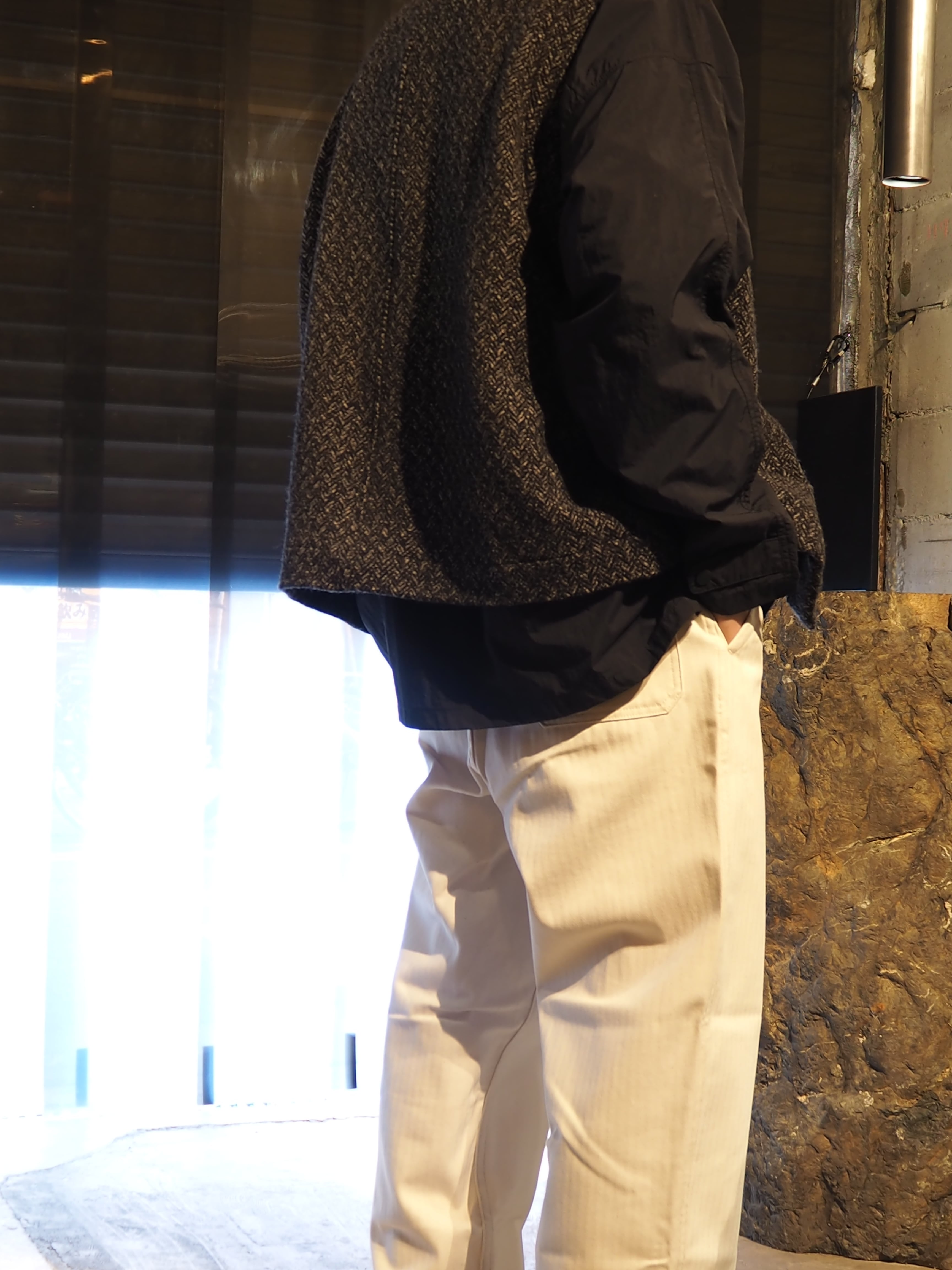 コシのあるヘリンボーン生地が魅力の一本で、ワークパンツのディテールを持ちながら実用性と上品さが両立しています。