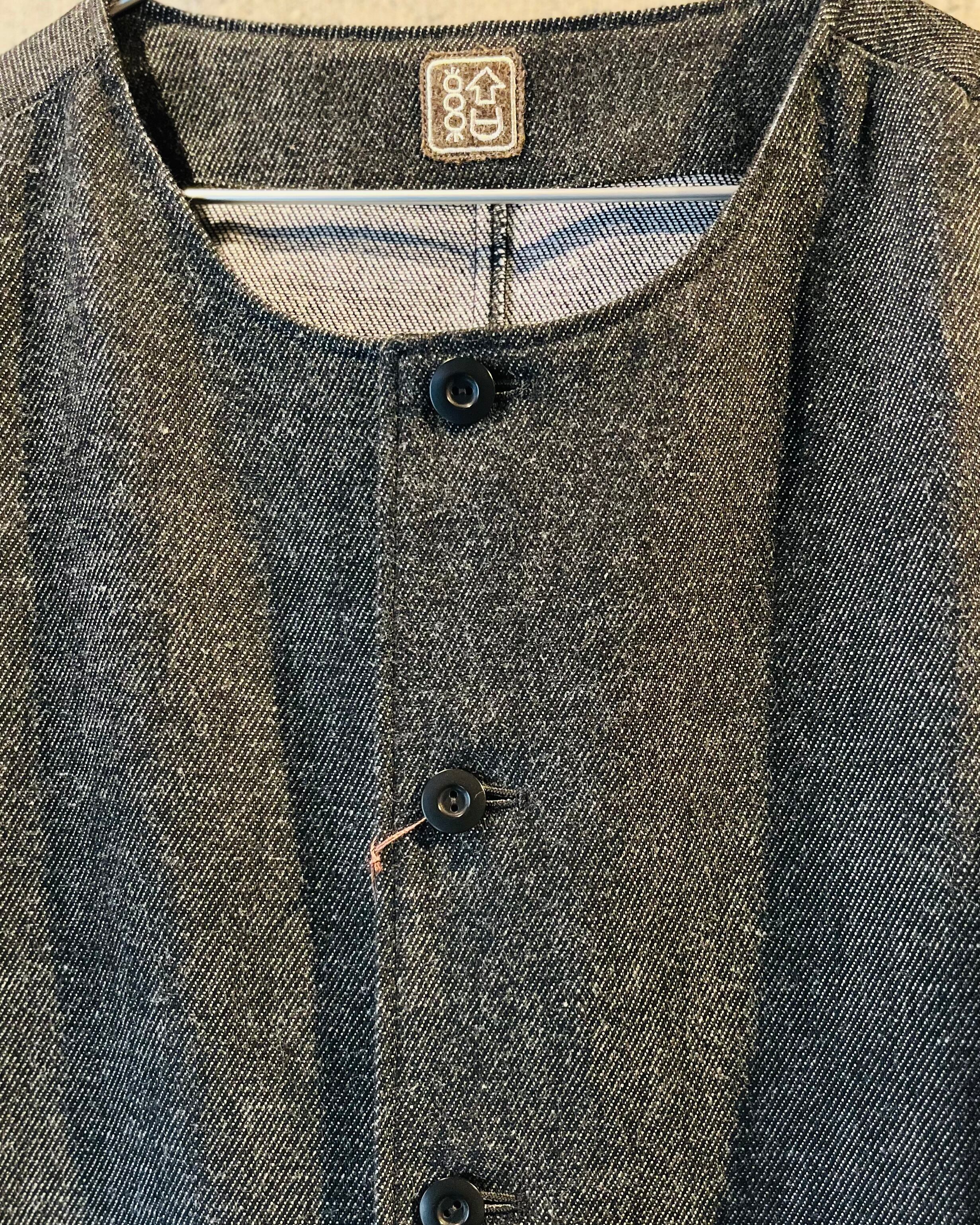 Crafted from black denim that reveals a striking contrast between warp and weft threads, the piece effortlessly blends the casual sensibility of a cardigan with the structured presence of a coverall.