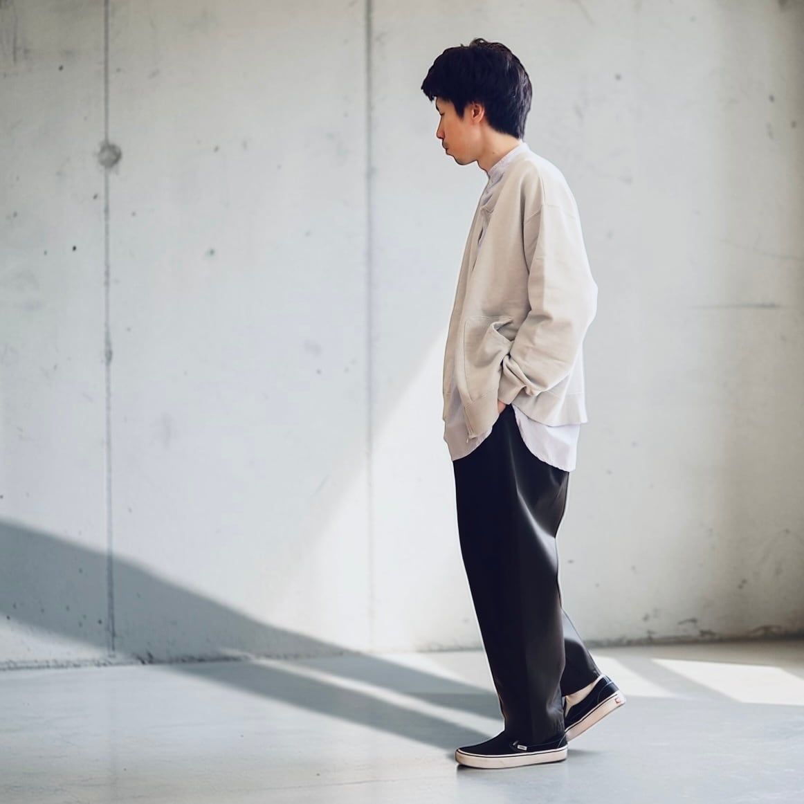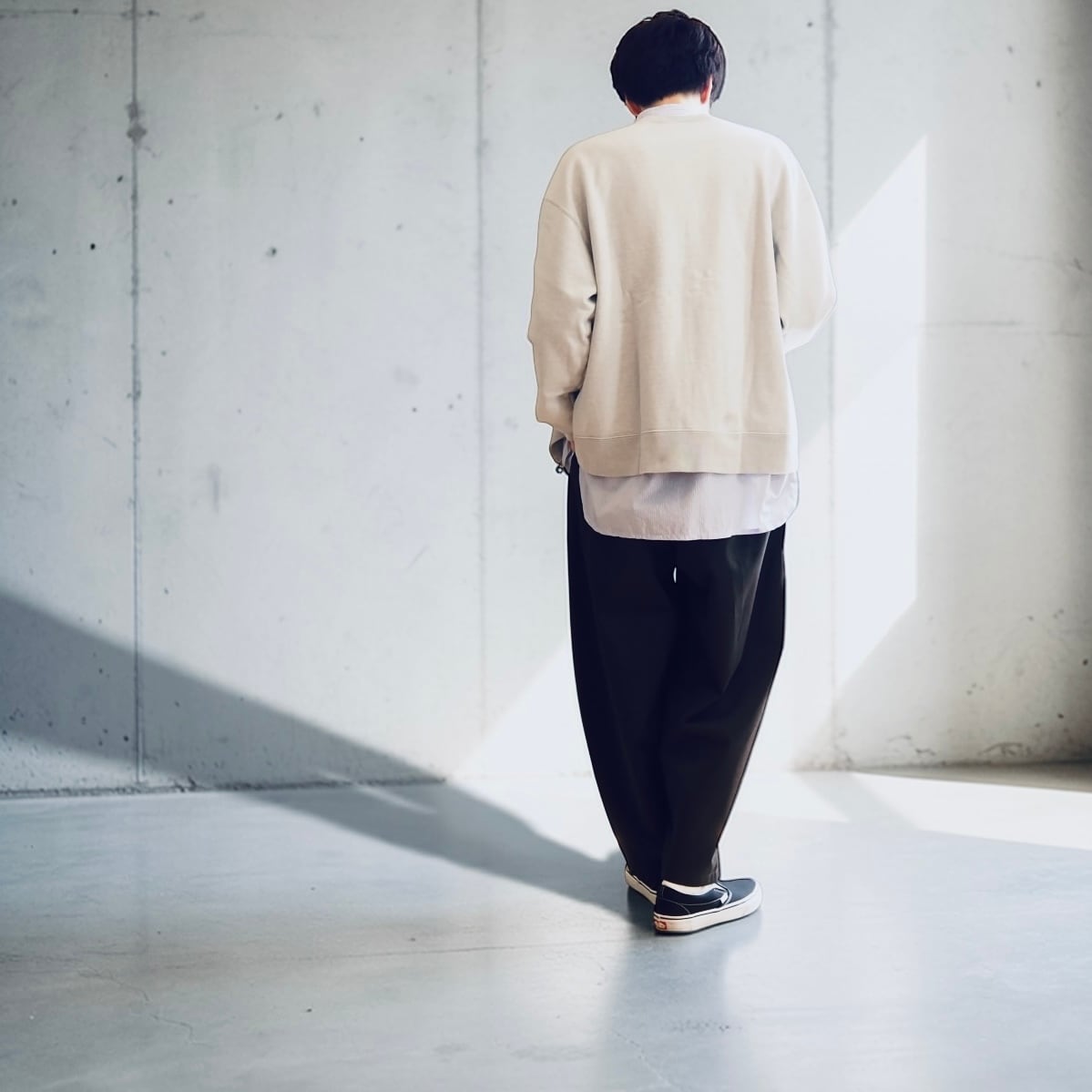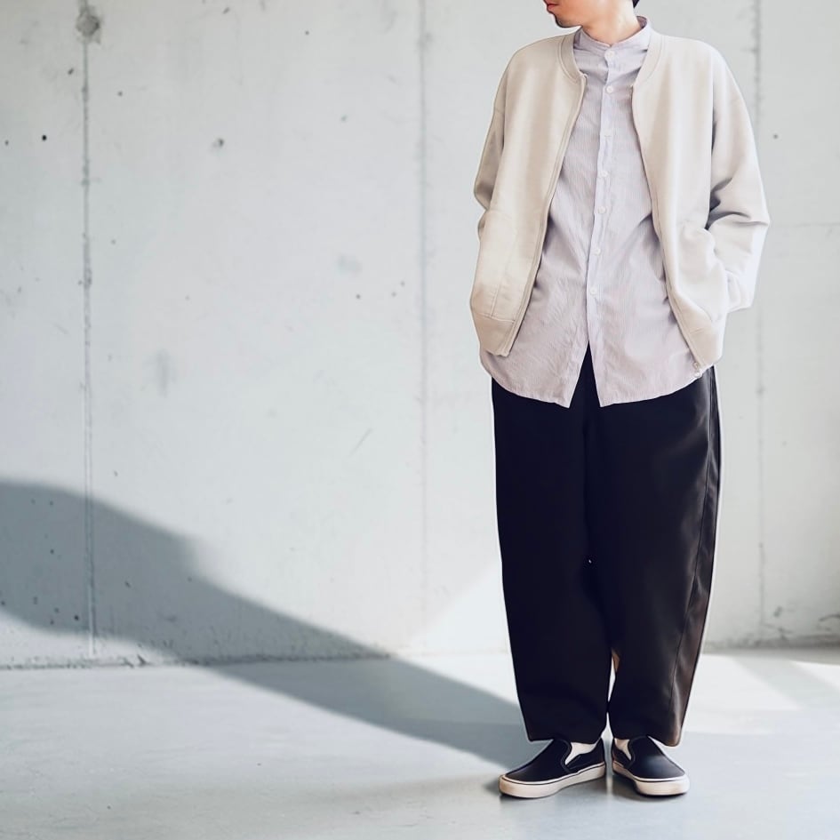 素材はオールシーズン対応のコットン100%。ユニセックス仕様でサイズは1と2の展開。小柄な方や細身の方、女性はサイズ1でバランス良く。ベルトを絞ってハイウエスト気味に穿くスタイルも自然に決まります。