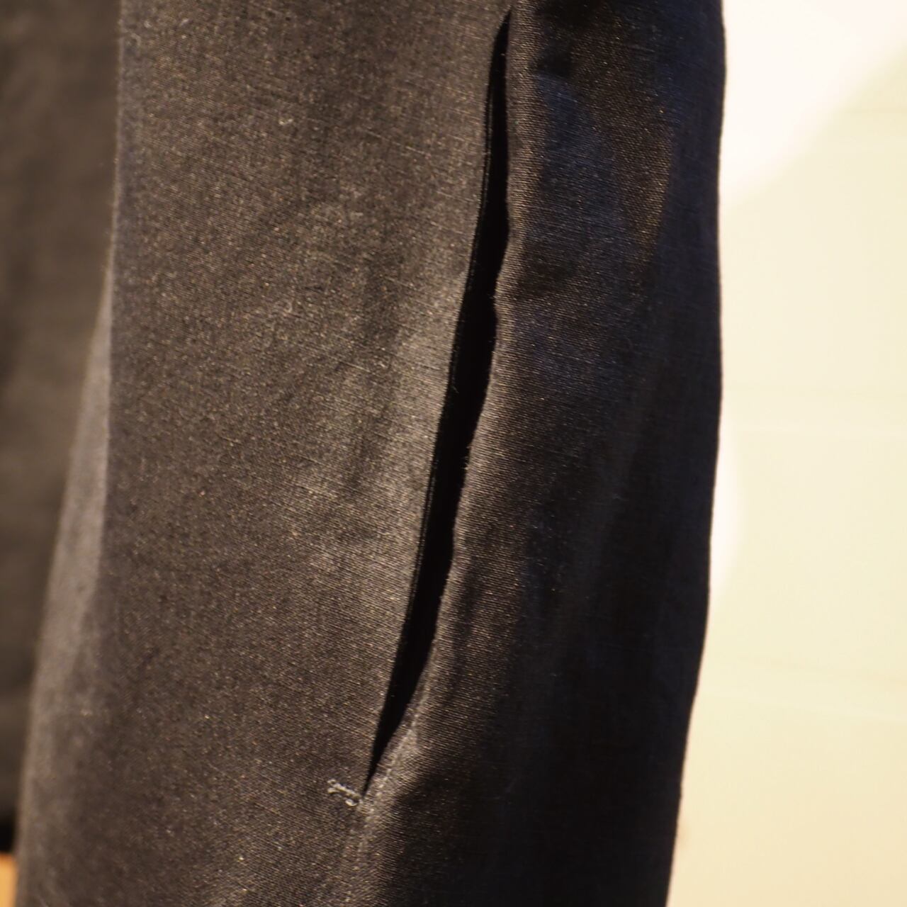 硫化染めを施したリネン100%の生地は、深みのある黒とほのかな光沢が特徴です。