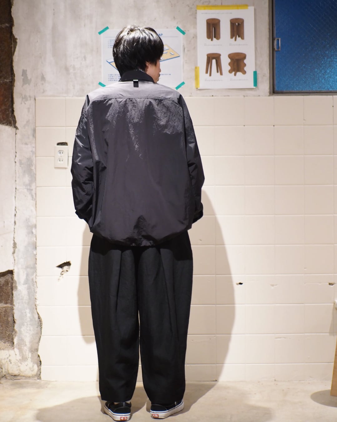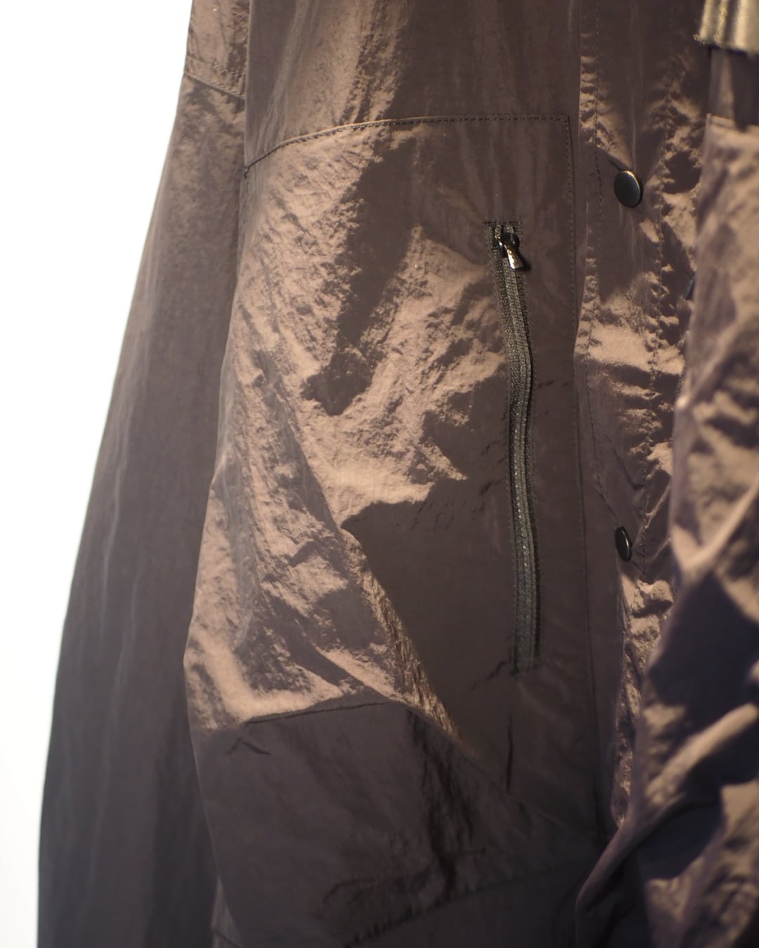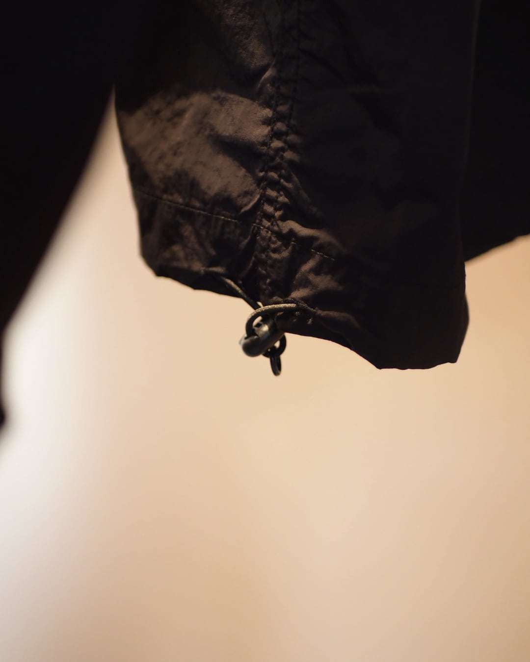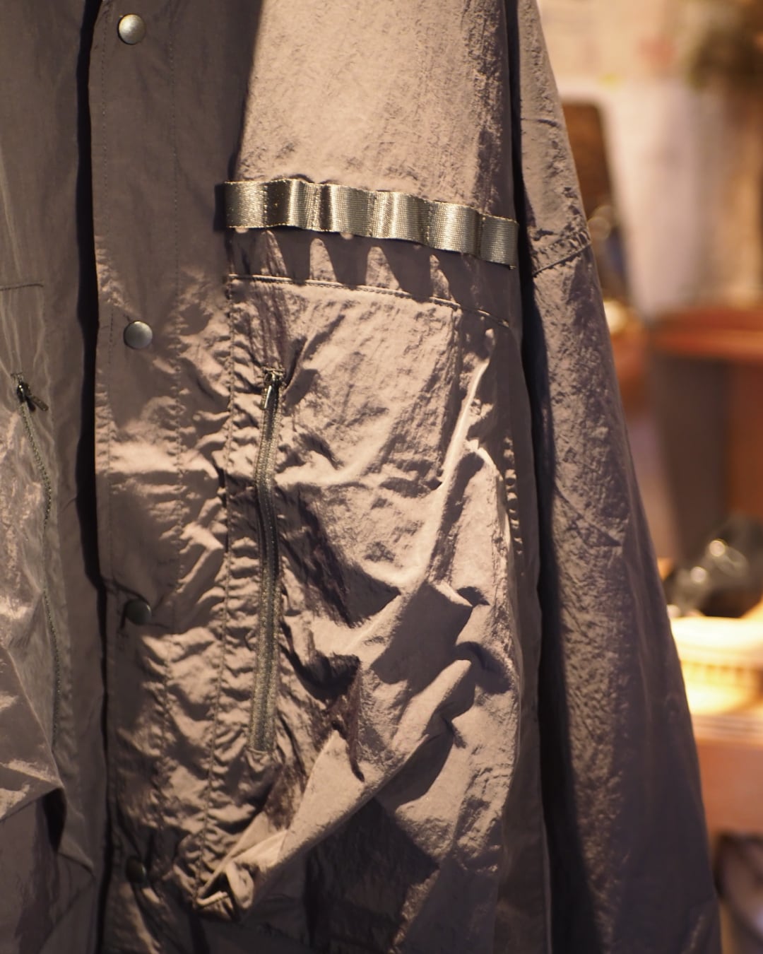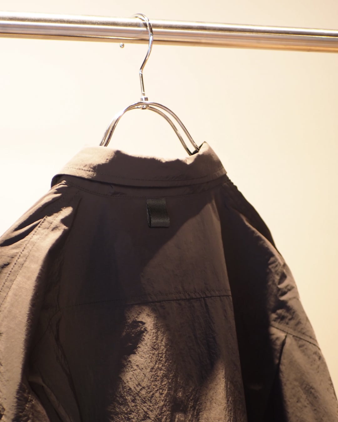 やや薄手のナイロンは、インナーとしても羽織りとしても使えて、着回しの幅が広いのが◎。ユニセックスのゆったりしたシルエットに、ポケットやドローコードのギミックが効いていて、着るたびに小さな発見があります。