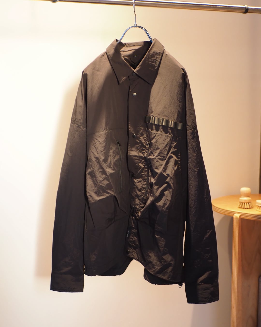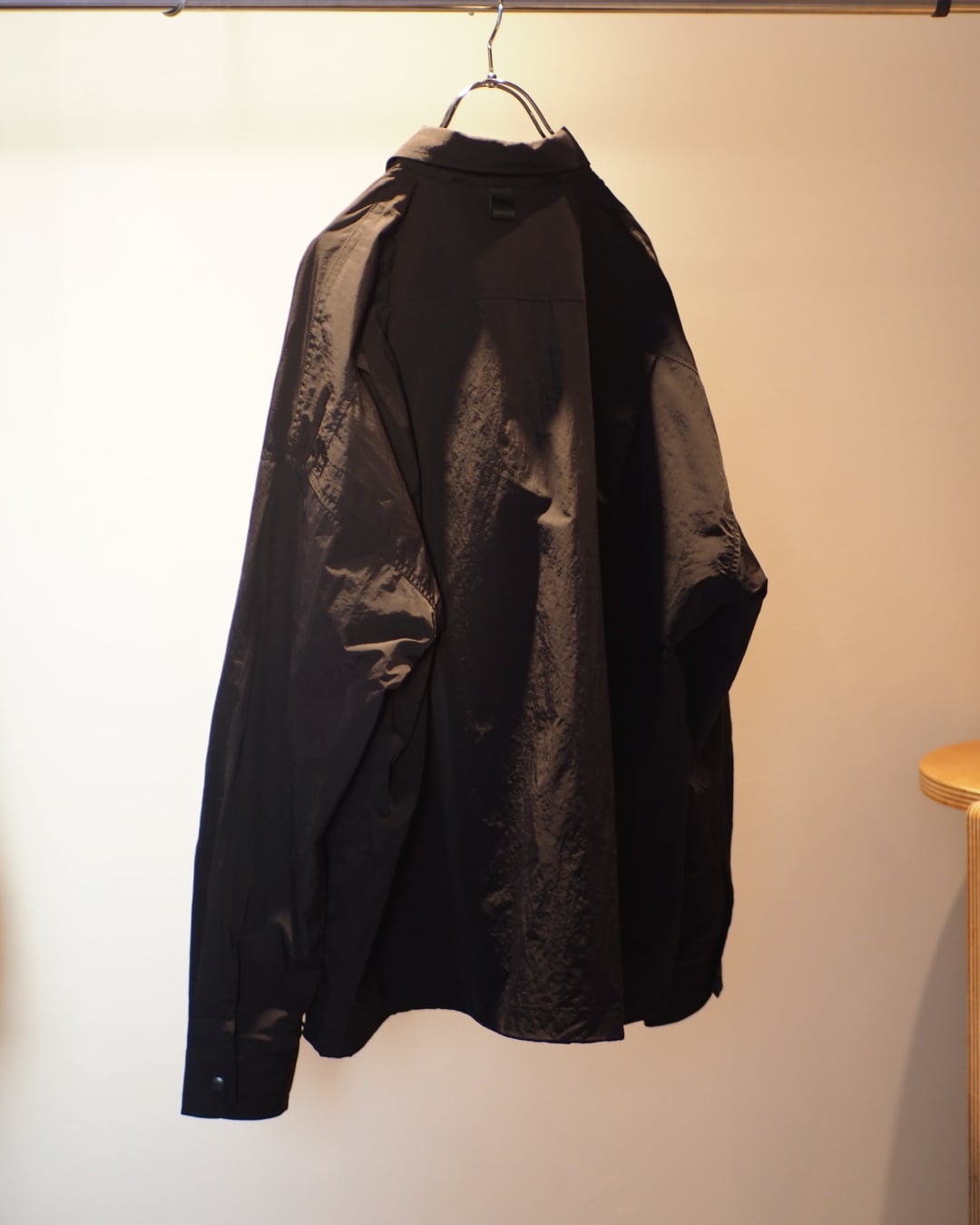 ミリタリーとミニマリズムの輪郭が溶け合った、オーバーサイズのテクニカルシャツジャケット。素材はしなやかで軽量なナイロン。動くたびに空気を含み、着ているというより纏っているような軽さを感じていただけます。